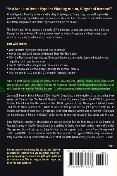 "How Can I Use Oracle Hyperion Planning to plan, budget and forecast?" Oracle Hyperion Planning is the market leading budgeting and forecasting solution that provides powerful planning capabilities over the web and in Microsoft Excel. You want to plan faster and more accurately and you are sure Oracle Hyperion Planning is the answer. This book is your key to unlocking the world of Planning from an end user perspective, guiding you through the ins and outs of Planning on your quest to a better budgeting and forecasting process which in turn leads to better enterprise performance. You will learn: ¿ What is Oracle Hyperion Planning and how to connect ¿ All of the Planning end user features like supporting detail, comments, document attachments, adjusting, grid spreader and more ¿ How to plan and build models in Microsoft Excel with Smart View ¿ How to perform adhoc analysis over the web and in Excel ¿ Steps to review and approve budgets through the approval process ¿ What's new in 11.1.2.2 and 11.1.2.3