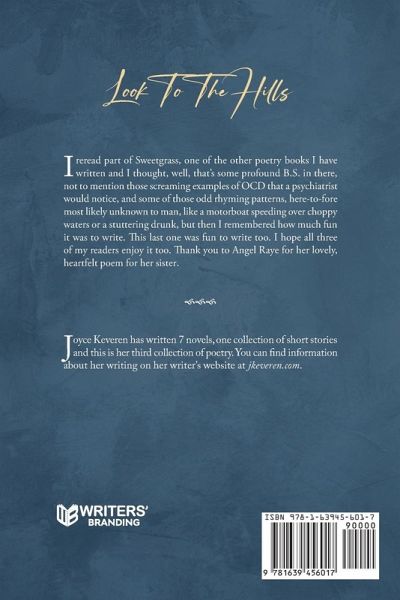 Book synopsis:I reread part of Sweetgrass, one of the other poetry books I have written and I thought, well, that's some profound B.S. in there, not to mention those screaming examples of OCD that a psychiatrist would notice, and some of those odd rhyming patterns, here-to-fore most likely unknown to man, like a motorboat speeding over choppy waters or a stuttering drunk, but then I remembered how much fun it was to write. This last one was fun to write too. I hope all three of my readers enjoy it too. Thank you to Angel Raye for her lovely, heartfelt poem for her sister. Autobiography: Joyce Keveren has written 7 novels, one collection of short stories and this is her third collection of poetry. You can find information about her writing on her writer's website at jkeveren.com.