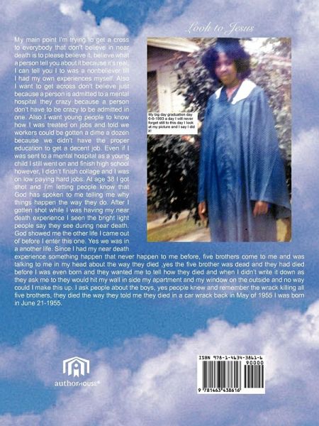My main point I'm trying to get a cross to everybody that don't believe in near death is to please believe it, believe what a person tell you about it because it's real, I can tell you I to was a nonbeliever till I had my own experiences myself. Also I want to get across don't believe just because a person is admitted to a mental hospital they crazy because a person don't have to be crazy to be admitted in one. Also I want young people to know how I was treated on jobs and told we workers could be gotten a dime a dozen because we didn't have the proper education to get a decent job. Even if I was sent to a mental hospital as a young child I still went on and finish high school however, I didn't finish collage and I was on low paying hard jobs. At age 38 I got shot and I'm letting people know that God has spoken to me telling me why things happen the way they do. After I gotten shot while I was having my near death experience I seen the bright light people say they see during near death. God showed me the other life I came out of before I enter this one. Yes we was in a another life. Since I had my near death experience something happen that never happen to me before, five brothers come to me and was talking to me in my head about the way they died ,yes the five brother was dead and they had died before I was even born and they wanted me to tell how they died and when I didn't write it down as they ask me to they would hit my wall in side my apartment and my window on the outside and no way could I make this up. I ask people about the boys, yes people knew and remember the wrack killing all five brothers, they died the way they told me they died in a car wrack back in May of 1955 I was born in June 21-1955.