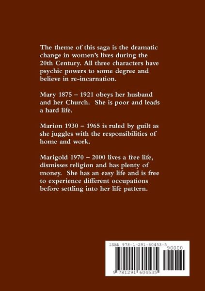 The theme of this saga is the dramatic change in women's lives during the 20th Century. There are three sections of 34-36,000 words. All three characters have psychic powers to some degree and believe in re-incarnation. Mary - 1875 - 1921 obeys her husband and her Church. She is poor and leads a hard life. Marion 1930 - 1965 is ruled by guilt as she juggles with the responsibilities of home and work. Marigold 1970 - 2000 lives a free life, dismisses religion and has plenty of money. She has an easy life and is free to experience different occupations before settling into her life pattern.