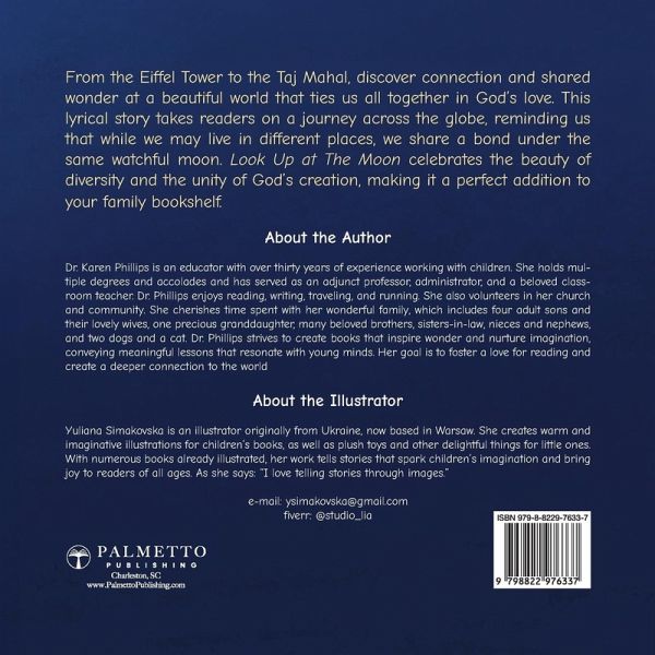 Embark on a heartwarming voyage throughout the many lands basking in the Moon's radiant light, and learn how we are all part of God's world! Dr. Karen Phillips, an experienced educator and storyteller, blends her passion for learning and faith to create a story that celebrates what makes us different and unique across nations and cultures. Looking up at the moon, children see shapes amid a light with which they can connect. But the moon sees them, too-all across a world connected by its gentle light. In Look Up at the Moon, Dr. Karen Phillips takes young readers across the globe to learn about the vast world that we call home. Children in France, China, New York, and India all experience that same beautiful luminescence-no matter where we live, we all share the same hopes, dreams, and wonder. With lyrical storytelling and vibrant illustrations, this book showcases prominent cultural landmarks, gorgeous geography, and the things that unite us all under God's love. From the Eiffel Tower to the Great Wall, experience the beauty of our world, and be reminded that we all exist under a sky crafted by a loving Creator who gives life and purpose to us all. Perfect for children, parents, and teachers who value global thinking, as well as for believers who want to remind their young ones who cares for them most, Look Up at The Moon inspires curiosity, compassion, and gratitude for the beauty of God's creation. This heartwarming book is a delightful addition to libraries and bookshelves in classrooms and homes, fostering meaningful conversations about connection and global awareness.