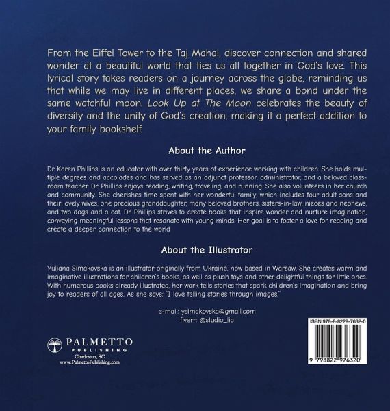 Embark on a heartwarming voyage throughout the many lands basking in the Moon's radiant light, and learn how we are all part of God's world! Dr. Karen Phillips, an experienced educator and storyteller, blends her passion for learning and faith to create a story that celebrates what makes us different and unique across nations and cultures. Looking up at the moon, children see shapes amid a light with which they can connect. But the moon sees them, too-all across a world connected by its gentle light. In Look Up at the Moon, Dr. Karen Phillips takes young readers across the globe to learn about the vast world that we call home. Children in France, China, New York, and India all experience that same beautiful luminescence-no matter where we live, we all share the same hopes, dreams, and wonder. With lyrical storytelling and vibrant illustrations, this book showcases prominent cultural landmarks, gorgeous geography, and the things that unite us all under God's love. From the Eiffel Tower to the Great Wall, experience the beauty of our world, and be reminded that we all exist under a sky crafted by a loving Creator who gives life and purpose to us all. Perfect for children, parents, and teachers who value global thinking, as well as for believers who want to remind their young ones who cares for them most, Look Up at The Moon inspires curiosity, compassion, and gratitude for the beauty of God's creation. This heartwarming book is a delightful addition to libraries and bookshelves in classrooms and homes, fostering meaningful conversations about connection and global awareness.