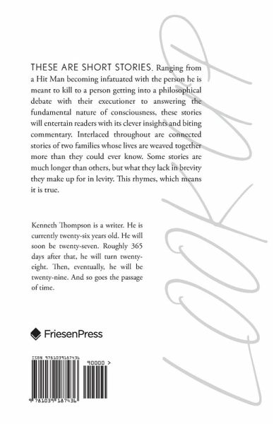 These are short stories. Ranging from a Hit Man becoming infatuated with the person he is meant to kill to a person getting into a philosophical debate with their executioner to answering the fundamental nature of consciousness, these stories will entertain readers with its clever insights and biting commentary. Interlaced throughout are connected stories of two families whose lives are weaved together more than they could ever know. Some stories are much longer than others, but what they lack in brevity they make up for in levity. This rhymes, which means it is true.