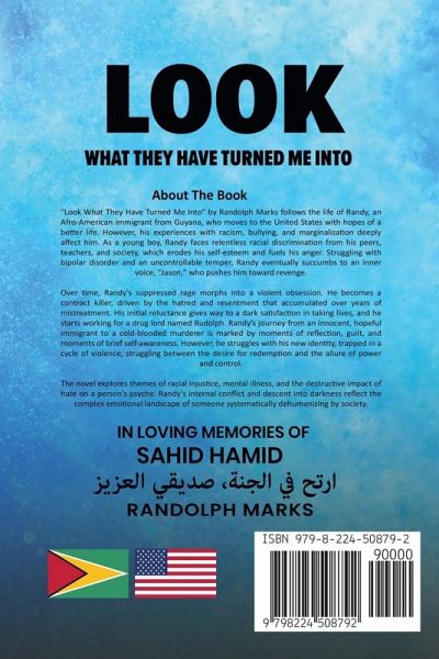 "Look What They Have Turned Me Into" by Randolph Marks follows the life of Randy, an Afro-American immigrant from Guyana, who moves to the United States with hopes of a better life. However, his experiences with racism, bullying, and marginalization deeply affect him. As a young boy, Randy faces relentless racial discrimination from his peers, teachers, and society, which erodes his self-esteem and fuels his anger. Struggling with bipolar disorder and an uncontrollable temper, Randy eventually succumbs to an inner voice, "Jason," who pushes him toward revenge. Over time, Randy's suppressed rage morphs into a violent obsession. He becomes a contract killer, driven by the hatred and resentment that accumulated over years of mistreatment. His initial reluctance gives way to a dark satisfaction in taking lives, and he starts working for a drug lord named Rudolph. Randy's journey from an innocent, hopeful immigrant to a cold-blooded murderer is marked by moments of reflection, guilt, and moments of brief self-awareness. However, he struggles with his new identity, trapped in a cycle of violence, struggling between the desire for redemption and the allure of power and control. The novel explores themes of racial injustice, mental illness, and the destructive impact of hate on a person's psyche. Randy's internal conflict and descent into darkness reflect the complex emotional landscape of someone systematically dehumanizing by society.