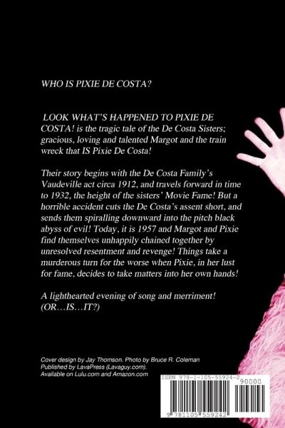 LOOK WHAT'S HAPPENED TO PIXIE DE COSTA! is the tragic tale of the De Costa Sisters; gracious, loving and talented Margot and the train wreck that IS Pixie De Costa! Their story beigins witht eh De Costa Family's Vaudeville act circa 1912, and travels forward in time to 1932, the height of the sisters' Movie Fame! But a horrible accident cuts the De Costa's assent short, and sends them spiralling downward into the pitch black abyss of evil! Today, it is 1957 and Margot and Pixie find themselves unhappily chained together by unresolved resentment and revenge! Things take a murderous turn for the worse when Pixie, in her lust for fame, decides to take matters into her own hands! A lighthearted evening of song and merriment... OR IS IT? Two acts. Roles for 4F, 5M.