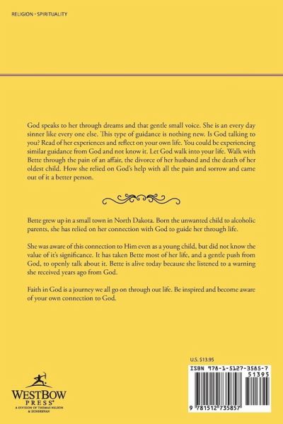 God speaks to her through dreams and that gentle small voice. She is an every day sinner like every one else. This type of guidance is nothing new. Is God talking to you? Read of her experiences and reflect on your own life. You could be experiencing similar guidance from God and not know it. Let God walk into your life. Walk with Bette through the pain of an affair, the divorce of her husband and the death of her oldest child. How she relied on God¿s help with all the pain and sorrow and came out of it a better person.