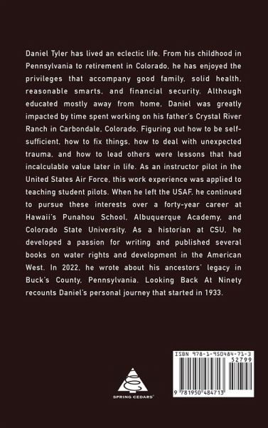 Daniel Tyler has lived an eclectic life. From his childhood in Pennsylvania to retirement in Colorado, he has enjoyed the privileges that accompany good family, solid health, reasonable smarts, and financial security. Although educated mostly away from home, Daniel was greatly impacted by time spent working on his father's Crystal River Ranch in Carbondale, Colorado. Figuring out how to be self-sufficient, how to fix things, how to deal with unexpected trauma, and how to lead others were lessons that had incalculable value later in life. As an instructor pilot in the United States Air Force, this work experience was applied to teaching student pilots. When he left the USAF, he continued to pursue these interests over a forty-year career at Hawaii's Punahou School, Albuquerque Academy, and Colorado State University. As a historian at CSU, he developed a passion for writing and published several books on water rights and development in the American West. In 2022, he wrote about his ancestors' legacy in Buck's County, Pennsylvania. Looking Back At Ninety recounts Daniel's personal journey that started in 1933.