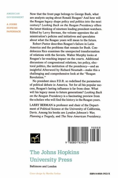 Now that the front page belongs to George Bush, what are analysts saying about Ronald Reagan? And how will the Reagan legacy shape policy and politics into the next century? "Looking Back on the Reagan Presidency" offers the latest thinking of nineteen leading president-watchers. Edited by Larry Berman, the volume appraises the administration's policies and initiatives and speculates about what the Reagan years will mean to the future. Robert Pastor describes Reagan's failure in Latin America and the problems that remain for Bush. Condoleezza Rice examines the unexpected transformation of relations with the Soviets. Walter Murphy looks at Reagan's far-reaching impact on the courts. Additional discussions of congressional relations, tax policy, electoral politics, the institution of the presidency-- and an insightful Afterword by Richard Neustadt-- make this a challenging and comprehensive look at the "Reagan Revolution". No president since F.D.R. so redefined the parameters of political debate in America. Yet for all his popular success, Reagan's lasting influence is far from clear. What will his legacy mean to future generations? "Looking Back on the Reagan Presidency" is a fascinating preview from the scholars who will find the history in the Reagan years.