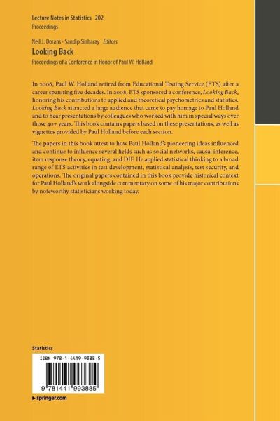 In 2006, Paul W. Holland retired from Educational Testing Service (ETS) after a career spanning five decades. In 2008, ETS sponsored a conference, Looking Back, honoring his contributions to applied and theoretical psychometrics and statistics. Looking Back attracted a large audience that came to pay homage to Paul Holland and to hear presentations by colleagues who worked with him in special ways over those 40+ years. This book contains papers based on these presentations, as well as vignettes provided by Paul Holland before each section.