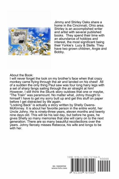 I will never forget the look on my brother's face when that crazy monkey came flying through the air and landed on his chest! All of a sudden the only thing Paul saw was four long hairy legs with a set of sharp fangs sailing through the air straight at him! However, I still think the Skunk story outdoes that one or maybe, "The Train" was paramount. No matter what, Johny thought to himself I have to get my sorry butt up and get this stuff on paper before I get distracted by life again. "Looking Back" is actually a story written by Shelly Owens-McKinney. It is about her favorite person in the entire world, her Uncle Johny. He is ninety-three years, eleven months and twenty nine days old. This will be his last day, but before he goes, he gives Shelly so many memories that she will carry on to the next generation. There are so many beautiful recollections over the years. Johny fiercely misses Rebecca, his wife and longs to be with her.