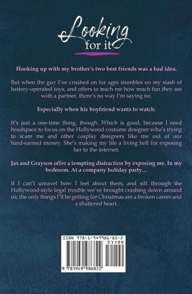 Hooking up with my brother's two best friends was a bad idea. But when the guy I've crushed on for ages stumbles on my stash of battery-operated toys, and offers to teach me how much fun they are with a partner, there's no way I'm saying no. Especially when his boyfriend wants to watch. It's just a one-time thing, though. Which is good, because I need headspace to focus on the Hollywood costume designer who's trying to scam me and other cosplay designers like me out of our hard-earned money. She's making my life a living hell for exposing her to the internet. Jax and Grayson offer a tempting distraction by exposing me. In my bedroom. At a company holiday party... If I can't unravel how I feel about them, and sift through the Hollywood-style legal trouble we've brought crashing down around us, the only things I'll be getting for Christmas are a broken career and a shattered heart.
