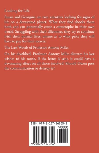 Looking for Life Susan and Georgina are two scientists looking for signs of life on a devastated planet. What they find shocks them both and can potentially cause a catastrophe in their own world. Struggling with their dilemmas, they try to continue with their normal lives, unsure as to what price they will have to pay for their secrets. The Last Words of Professor Antony Miles On his deathbed, Professor Antony Miles dictates his last wishes to his nurse. If the letter is sent, it could have a devastating effect on all those involved. Should Owen post the communication or destroy it?
