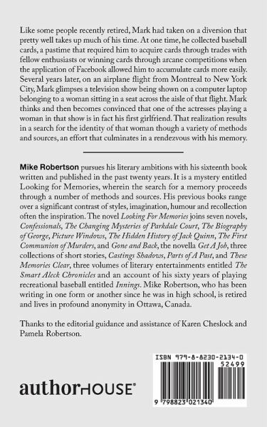 Like some people recently retired, Mark had taken on a diversion that pretty well takes up much of his time. At one time, he collected baseball cards, a pastime that required him to acquire cards through trades with fellow enthusiasts or winning cards through arcane competitions when the application of Facebook allowed him to accumulate cards more easily. Several years later, on an airplane flight from Montreal to New York City, Mark glimpses a television show being shown on a computer laptop belonging to a woman sitting in a seat across the aisle of that flight. Mark thinks and then becomes convinced that one of the actresses playing a woman in that show is in fact his first girlfriend. That realization results in a search for the identity of that woman though a variety of methods and sources, an effort that culminates in a rendezvous with his memory.