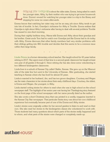 Looking for Trouble is about the older sister, Emma, being asked to watch her younger sister, Abby, by their mother who was trying to get some housework done. Emma's reward for watching her younger sister is a trip to the library and stopping for some ice cream afterwards. Emma knows that watching her sister may not be an easy job since Abby tends to get into lots of trouble. In fact, Grandpa's nickname for Abby is Trouble. Emma realizes that Grandpa is right about Abby's nickname after having to deal with several problems Trouble has caused in one short morning. During their nightly bedtime story, Mama tells Emma and Abby about their grandpa and his brother. Great-uncle Tom had to watch over Grandpa just like Emma had to do today with Abby. Emma discovers that other family members had very similar problems with their siblings getting into BIG trouble and decides that this seems to be a common issue within their large family.