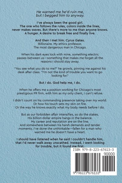"Most of the time, when I tell someone to do something, they obey me, Presley. Maybe you need a gentle reminder?" You know what they say about trouble...if you go looking for it, you'll probably find it. But I wasn't looking-at least that's what I told myself when I met him. Wrapped in a bespoke suit and twenty years older than me-Cyrus Gates, the heartless billionaire of Chicago and my new professor. I should have known from that first meeting, when his lips curled into a devious grin, his dark eyes raking their way slowly over my body as my stomach flipped. I'm merely the innocent little prey to his insatiable predator. When I moved to Chicago for college, I promised myself I'd let loose, but here I am in my last semester of grad school and I'm still the same good girl. Inside, there's still a woman who wants to explore the world on her own terms, dying to break free, dying to know what's behind those dark eyes. With a reputation like his: cold, calculated and every bit the domineering powerhouse the world makes him out to be, Cyrus is the kind of man I should run from. The kind of man that gets off on conquering anything and anyone. But he comes to me with an offer I can't refuse-a publicist job at the most prestigious public relations firm in Chicago tasked with cleaning up his image. The catch...he's the client. No matter how much I try to stand up to him, no matter how much I try to fight my desire, he can see straight through me. Something inside me ignites, knowing a man this powerful wants me and has no shame expressing it. But this isn't just an innocent game of cat and mouse-it's a lesson you learn the hard way. He's risking losing a multibillion-dollar deal of a lifetime and I'm risking my entire future. Just when I think there's a happily ever after in our sights, he pulls the rug out from under me and I'm left with a target on my back from his enemies. He warned me-he isn't the kind of man you just walk away from unscathed, but I didn't listen. Instead, I dove in head first with a heart of glass, falling for a man who doesn't have a heart at all. Looking For Trouble is a VERY steamy, slow-burn age-gap romance filled with suspense! Dripping with so much taboo spice you just might melt. You've been warned. This book is a complete standalone with no cheating or cliff-hangers.