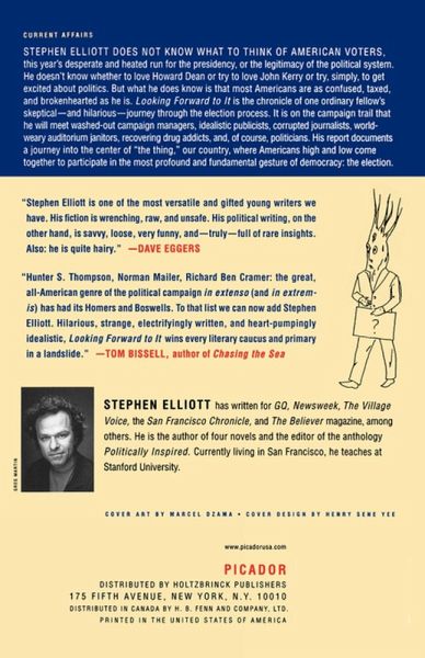 Stephen Elliott does not know what to think of American voters, this year's desperate and heated run for presidency, or the legitimacy of the political system. He doesn't know whether to love John Kerry or try to love Howard Dean or try, simply, to get excited about Politics. But what he does know is that most Americans are as confused, taxed and broken-hearted as he is. Looking Forward To It is the chronicle of one ordinary fellow's skeptical -- and hilarious -- journey through the election process. It is on the campaign trail that he will meet washed-out campaign managers, idealistic publicists, corrupt journalists, world-weary auditorium janitors, recovering drug addicts, and, of course, politicians. His report documents a journey into the center of "the thing", our country, where Americans high and low come together to participate in the most profound gesture of democracy: the election.