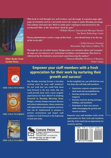 Has Monday morning become a less-than-exciting event for your staff members? Do you wish that you could help them look forward to the new week; that you could provide them with a more tangible appreciation for their efforts? In Looking Forward to Monday Morning, Diane Hodges, a former human resources director and school administrator, shares numerous staff appreciation and recognition activities that can be implemented to promote a positive environment and inspire staff members to look forward to the beginning of each new week.
