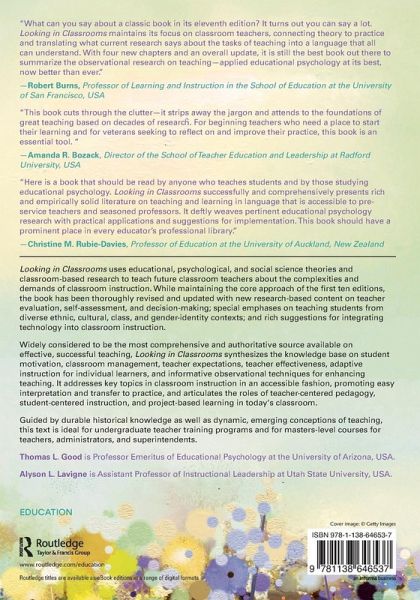 Looking in Classrooms uses educational, psychological, and social science theories and classroom-based research to teach future classroom teachers about the complexities and demands of classroom instruction. While maintaining the core approach of the first ten editions, the book has been thoroughly revised and updated with new research-based content on teacher evaluation, self-assessment, and decision-making; special emphases on teaching students from diverse ethnic, cultural, class, and gender-identity contexts; and rich suggestions for integrating technology into classroom instruction.