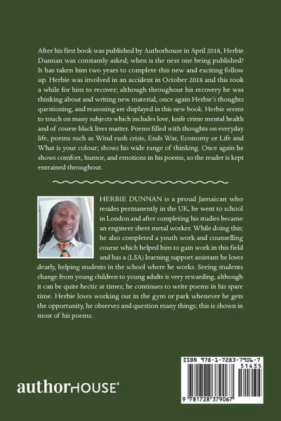 After his first book was published by Authorhouse in April 2018, Herbie Dunnan was constantly asked; when is the next one being published? It has taken him two years to complete this new and exciting follow up. Herbie was involved in an accident in October 2018 and this took a while for him to recover; although throughout his recovery he was thinking about and writing new material, once again Herbie's thoughts questioning, and reasoning are displayed in this new book. Herbie seems to touch on many subjects which includes love, knife crime mental health and of course black lives matter. Poems filled with thoughts on everyday life, poems such as Wind rush crisis, Ends War, Economy or Life and What is your colour; shows his wide range of thinking. Once again he shows comfort, humor, and emotions in his poems, so the reader is kept entrained throughout.