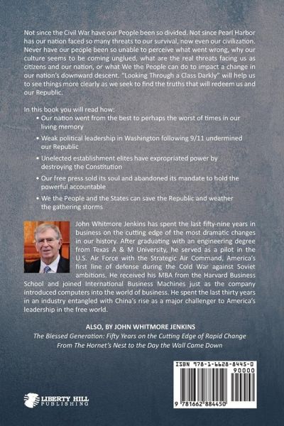Not since the Civil War have our People been so divided. Not since Pearl Harbor has our nation faced so many threats to our survival, now even our civilization. Never have our people been so unable to perceive what went wrong, why our culture seems to be coming unglued, what are the real threats facing us as citizens and our nation, or what We the People can do to impact a change in our nation's downward descent. "Looking Through a Class Darkly" will help us to see things more clearly as we seek to find the truths that will redeem us and our Republic. In this book you will read how: ¿ Our nation went from the best to perhaps the worst of times in our living memory ¿ Weak political leadership in Washington following 9/11 undermined our Republic ¿ Unelected establishment elites have expropriated power by destroying the Constitution ¿ Our free press sold its soul and abandoned its mandate to hold the powerful accountable ¿ We the People and the States can save the Republic and weather the gathering storms John Whitmore Jenkins has spent the last fifty-nine years in business on the cutting edge of the most dramatic changes in our history. After graduating with an engineering degree from Texas A & M University, he served as a pilot in the U.S. Air Force with the Strategic Air Command, America's first line of defense during the Cold War against Soviet ambitions. He received his MBA from the Harvard Business School and joined International Business Machines just as the company introduced computers into the world of business. He spent the last thirty years in an industry entangled with China's rise as a major challenger to America's leadership in the free world. ALSO, BY JOHN WHITMORE JENKINS The Blessed Generation: Fifty Years on the Cutting Edge of Rapid Change From The Hornet's Nest to the Day the Wall Came Down