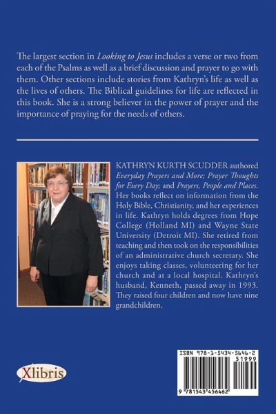 The largest section in Looking to Christ includes a verse or two from each of the "Psalms" as well as a brief discussion and prayer to go with them. Other sections include stories from Kathryn’s life as well as the lives of others. The Biblical guidelines for life are reflected in this book. She is a strong believer in the power of prayer and the importance of praying for the needs of others.