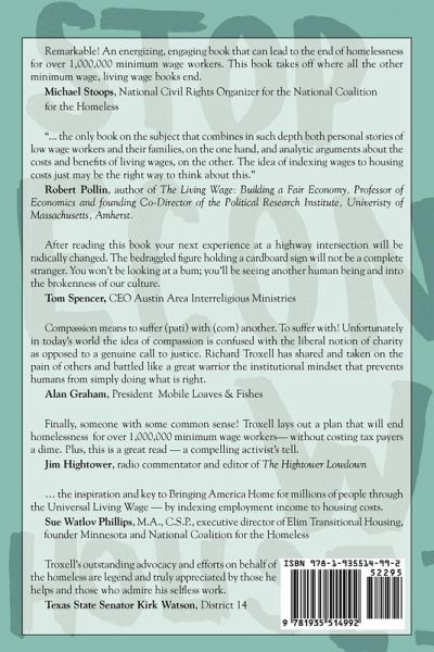 Remarkable! An energizing, engaging book that can lead to the end of homelessness for over 1,000,000 minimum wage workers. This book takes off where all the other minimum wage, living wage books end. Michael Stoops, National Civil Rights Organizer for the National Coalition for the Homeless "... the only book on the subject that combines in such depth both personal stories of low wage workers and their families, on the one hand, and analytic arguments about the costs and benefits of living wages, on the other. The idea of indexing wages to housing costs just may be the right way to think about this." Robert Pollin, author of The Living Wage: Building a Fair Economy Troxell's accounts of the homeless point to a profound break down in our culture - a society that grows more rootless and disconnected with each passing year. After reading this book your next experience at a highway intersection will be radically changed. The bedraggled figure holding a cardboard sign will not be a complete stranger. You won't be looking at a bum; you'll be seeing another human being and into the brokenness of our culture. Tom Spencer, CEO Austin Area Interreligious Ministries Compassion means to suffer (pati) with (com) another. To suffer with! Unfortunately in today's world the idea of compassion is confused with the liberal notion of charity as opposed to a genuine call to justice. Richard Troxell has shared and taken on the pain of others and battled like a great warrior the institutional mindset that prevents humans from simply doing what is right. Alan Graham, President Mobile Loaves & Fishes Finally, someone with some common sense! Troxell lays out a plan that will end homelessness for over 1,000,000 minimum wage workers- without costing tax payers a dime. Plus, this is a great read - a compelling activist's tell. Jim Hightower, radio commentator and editor of The Hightower Lowdown ... the inspiration and key to Bringing America Home for millions of people through the Universal Living Wage - by indexing employment income to housing costs. Sue Watlov Phillips, M.A., C.S.P., executive director of Elim Transitional Housing, founder Minnesota and National Coalition for the Homeless Troxell's outstanding advocacy and efforts on behalf of the homeless are legend and truly appreciated by those he helps and those who admire his selfless work. Texas State Senator Kirk Watson, District 14
