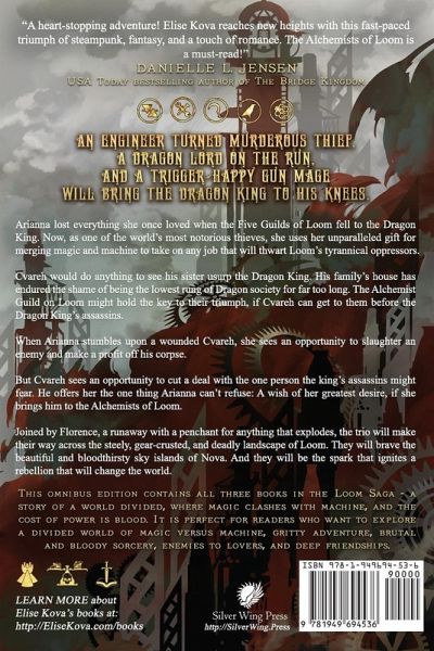 This *omnibus edition* contains all three books in the Loom Saga by USA Today bestselling author Elise Kova. It is all five books bound as one, large manuscript. An engineer turned murderous thief, a Dragon lord on the run, and a trigger-happy gun mage will bring the Dragon King to his knees. Arianna lost everything she once loved when the Five Guilds of Loom fell to the Dragon King. Now, as one of the world's most notorious thieves, she uses her unparalleled gift for merging magic and machine to take on any job that will thwart Loom's tyrannical oppressors. Cvareh would do anything to see his sister usurp the Dragon King. His family's house has endured the shame of being the lowest rung of Dragon society for far too long. The Alchemist Guild on Loom might hold the key to their triumph, if Cvareh can get to them before the Dragon King's assassins. When Arianna stumbles upon a wounded Cvareh, she sees an opportunity to slaughter an enemy and make a profit off his corpse. But Cvareh sees an opportunity to cut a deal with the one person the king's assassins might fear. He offers her the one thing Arianna can't refuse: A wish of her greatest desire, if she brings him to the Alchemists of Loom. Joined by Florence, a runaway with a penchant for anything that explodes, the trio will make their way across the steely, gear-crusted, and deadly landscape of Loom. They will brave the beautiful and bloodthirsty sky islands of Nova. And they will be the spark that ignites a rebellion that will change the world. The Loom Saga is a story of a world divided, where magic clashes with machine, and the cost of power is blood. It is perfect for readers who want to explore a divided world of magic versus machine, gritty adventure, brutal and bloody sorcery, enemies to lovers, and deep friendships.