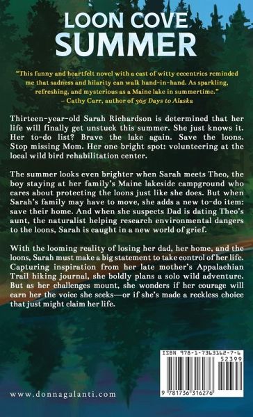 "A warm-hearted novel ... balances profound loss with humor and hope." - Kate Allen, author of The Line Tender Thirteen-year-old Sarah Richardson is determined that her life will finally get unstuck this summer. She just knows it. Her to-do list? Brave the lake again. Save the loons. Stop missing Mom. Her one bright spot: volunteering at the local wild bird rehabilitation center. The summer looks even brighter when Sarah meets Theo, the boy staying at her family's Maine lakeside campground who cares about protecting the loons just like she does. But when Sarah's family may have to move, she adds a new to-do item: save their home. And when she suspects Dad is dating Theo's aunt, the naturalist helping research environmental dangers to the loons, Sarah is caught in a new world of grief. With the looming reality of losing her dad, her home, and the loons, Sarah must make a big statement to take control of her life. Capturing inspiration from her late mother's Appalachian Trail hiking journal, she boldly plans a solo wild adventure. But as her challenges mount, she wonders if her courage will earn her the voice she seeks-or if she's made a reckless choice that just might claim her life. "As sparkling, refreshing, and mysterious as a Maine lake in summertime." - Cathy Carr, author of 365 Days to Alaska