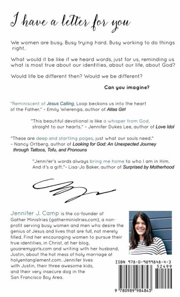 "Loop is just beautiful-a rich, inviting collection of love letters from our Father in heaven to his daughters on earth." ~ Shauna Niequist, author of Bread and Wine "Reminiscent of Jesus Calling, Loop beckons us into the heart of the Father." ~ Emily Wierenga, author of Atlas Girl "This beautiful devotional is like a whisper from God straight to our hearts." ~ Jennifer Dukes Lee, author of Love Idol "These are deep and startling pages, just what our souls need." ~ Nancy Ortberg, author of Looking for God We women are busy. Busy trying hard. Busy working to do things right. What would it be like if we heard words, just for us, reminding us what is most true about our identities, about our life, about God? Would life be different then? Would we be different? Can you imagine? Loop is a one year, twice-a-week, Christian devotional for busy women. It is a collection of whispers to women, encouraging them to lead lives that are less "filled" with things to do and check lists to complete and more "full" of love from God. Loop is for women who are busy. Women who are weary. Women who are lost. Women who are finally ready to lay down their burdens. Women who are eager to abandon the lies they've been believing-about God, about themselves, about how they are made and what they are designed to do. Loop is written for you.