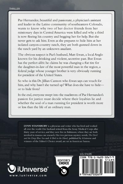 Paz Hernandez, beautiful and passionate, a physician's assistant and leader in the Latino community of southeastern Colorado, wants to know why two of her doctor friends from her missionary days in Central America were killed and why a third is now fleeing his country and begging her for help. But she never gets to ask him. Even as she prepares to hide him at her isolated canyon-country ranch, they are both gunned down in the ranch yard by an unknown assailant. The obvious suspect is Paz's husband, Matt Ewan, a local Anglo known for his drinking and violent, secretive past. But Ewan has the perfect alibi: he claims he was changing a flat tire for the daughter-in-law of the most powerful man in the region, a federal judge whose younger brother is very obviously running for president of the United States. So who is this Dr. Jillian Cannon who Ewan says can vouch for him, and why hasn't she turned up? What does she have to hide-or to hide from? In the end, everyone swept into the maelstrom of Paz Hernandez's passion for justice must decide where their loyalties lie and whether the soul of a man running for president is worth more or less than the life of an ordinary man.
