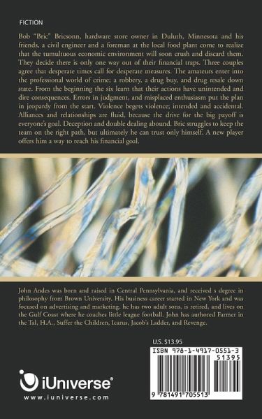 Bob "Bric" Bricsonn, hardware store owner in Duluth, Minnesota and his friends, a civil engineer and a foreman at the local food plant come to realize that the tumultuous economic environment will soon crush and discard them. They decide there is only one way out of their financial traps. Three couples agree that desperate times call for desperate measures. The amateurs enter into the professional world of crime; a robbery, a drug buy, and drug resale down state. From the beginning the six learn that their actions have unintended and dire consequences. Errors in judgment, and misplaced enthusiasm put the plan in jeopardy from the start. Violence begets violence; intended and accidental. Alliances and relationships are fluid, because the drive for the big payoff is everyone's goal. Deception and double dealing abound. Bric struggles to keep the team on the right path, but ultimately he can trust only himself. A new player offers him a way to reach his financial goal.