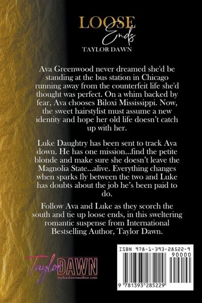Ava Greenwood never dreamed she'd be standing at the bus station in Chicago running away from the counterfeit life she'd thought was perfect. On a whim backed by fear, Ava chooses Biloxi Mississippi. Now, the sweet hairstylist must assume a new identity and hope her old life doesn't catch up with her. Luke Daughtry has been sent to track Ava down. He has one mission…find the petite blonde and make sure she doesn't leave the Magnolia State…alive. Everything changes when sparks fly between the two and Luke has doubts about the job he's been paid to do. Follow Ava and Luke as they scorch the south and tie up loose ends, in this sweltering romantic suspense from International Bestselling Author, Taylor Dawn.