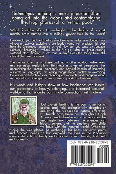 Ever wonder what it's like alone at midnight in the depths of a vast marsh, or thought of stumbling into a roiling geyser field in the dark? What happens when you get swept along for miles in a flooded river without an exit—or explore a prehistoric swamp with predators left over from the Cretaceous? How can you sense an Amazon rainforest breathing? Have you watched a great ancient waterfall cease forever in less than a day? Does the Jersey Devil still inhabit the pine barrens? Let the author take you on these and many other outdoor adventures and investigations as a professional ecologist and naturalist. He looks for meaning in the wildest places, and shows us a range of perspectives for appreciating the mental, emotional, and physical benefits of immersing ourselves in wild landscapes. He brings needed context by examining the causes-and-effects of ever changing environments, and brings us along as he restores damaged streams, rivers and wetlands. His poetic descriptions and insights show us how landscapes inspire perceptions of beauty, art, and increased personal well-being that underlie our innate connections with nature. Along the way, the author immerses the reader into his landscapes with keen-eyed observations that underlie our innate personal connections with nature. He shows how we gain insights and increased well-being when we go afield to explore. As he says, "Sometimes nothing is more important than going off into the woods and contemplating the frog chorus of a vernal pool." To quote from the professional editors at Self-Publishing Reviews: "A beautiful reflection on humanity's responsibility and relationship to the diverse ecosystems of our natural world…would make both Darwin and Steinbeck proud. Transcending mere observation…the prose unearths an astonishing story of geologic history and the nuanced inner workings of our dynamic natural world. Anthropological, philosophical, spiritual, and above all passionate, this is the sort of book that could inspire even a hardened city-dweller to intentionally get lost in the woods"; 5 Stars