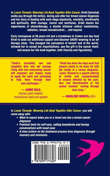 In Loose Threads: Weaving Life Back Together After Cancer, Kristi Sainchuk walks you through life before, during and after her breast cancer diagnosis and her story of dealing with each stage physically, mentally, emotionally and spiritually. With courage, humor and resilience, Kristi shares her experiences of chemotherapy, a double bilateral radical mastectomy, radiation, breast reconstruction ... and beyond. Early menopause at 36 years old and a breakdown in Costco one day lead Kristi to seek out additional support and discover SAORI weaving in an art therapy class. This changed her perception of herself and of the world, allowed her to accept her imperfections, see the gift in the cancer itself, and weave her life back together, both literally and figuratively.