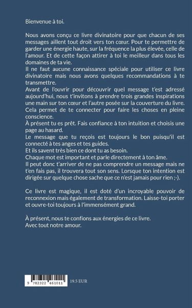 Bienvenue à toi.Ce livre divinatoire est conçu pour que chacun de ses messages aillent tout droit vers ton coeur.Pour te permettre de garder une énergie haute, sur la fréquence la plus élevée, celle de l'amour.Il ne faut aucune connaissance spéciale pour utiliser ce livre divinatoire mais j'ai quelques recommandations à te transmettre.Avant de l'ouvrir pour découvrir quel message t'est adressé aujourd'hui, je t'invite à prendre trois grandes inspirations une main sur le coeur et l'autre posée sur la couverture du livre. Cela permet de te connecter pour faire les choses en pleine conscience.À présent tu es prêt. Fais confiance à ton intuition et choisis une page au hasard.Le message que tu reçois est toujours le bon puisqu'il est connecté à tes anges et tes guides.