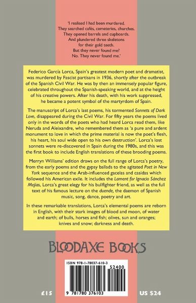 A new dual-language edition of poems from Spain's greatest modern poet and dramatist. Federico García Lorca was murdered by Fascist partisans in 1936, shortly after the outbreak of the Spanish Civil War. He was by then an immensely popular figure, celebrated throughout the Spanish-speaking world, and at the height of his creative powers. After his death, with his work suppressed, he became a potent symbol of the martyrdom of Spain. The manuscript of Lorca's last poems, his tormented Sonnets of Dark Love, disappeared during the Civil War. For fifty years the poems lived only in the words of the poets who had heard Lorca read them, like Neruda and Aleixandre, who remembered them as 'a pure and ardent monument to love in which the prime material is now the poet's flesh, his heart, his soul wide open to his own destruction'. Lorca's lost sonnets were re-discovered in Spain during the 1980s, and Merryn Williams's original 1992 edition of his Selected Poems was the first to include English translations of these brooding poems. This new dual-language Spanish-English edition of her iconic translation draws on the full range of Lorca's poetry, from the early poems and the gypsy ballads to the agitated Poet in New York sequence and the Arab-influenced gacelas and casidas which followed his American exile. It includes the Lament for Ignacio Sánchez Mejías, Lorca's great elegy for his bullfighter friend, as well as the full text of his famous lecture on the duende, the daemon of Spanish music, song, dance, poetry and art. In these remarkable translations, Lorca's elemental poems are reborn in English, with their stark images of blood and moon, of water and earth; of bulls, horses and fish; olives, sun and oranges; knives and snow; darkness and death.