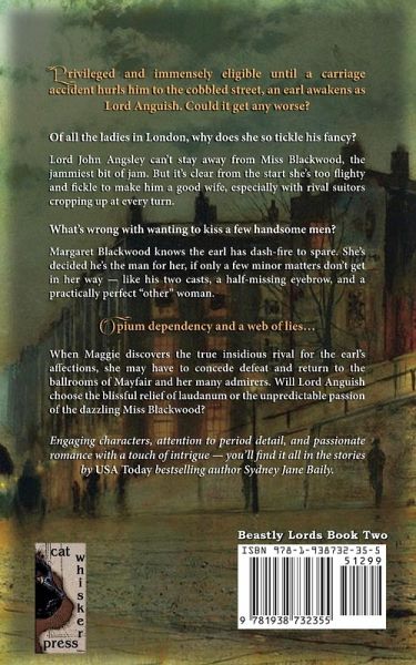 Privileged and immensely eligible until a carriage accident hurls him to the cobbled street, an earl awakens as Lord Anguish. Could it get any worse? Of all the ladies in London, why does this one tickle his fancy? Lord John Angsley can't stay away from Miss Blackwood, the jammiest bit of jam. But it's clear from the start she's too flighty and fickle to make him a good wife, especially with rival suitors cropping up at every turn. What's wrong with wanting to kiss a few handsome men? Margaret Blackwood knows the earl has dash-fire to spare. She's decided he's the man for her, if only a few minor matters don't get in her way - like his two casts, a half-missing eyebrow, and a practically perfect "other" woman. Opium dependency and a web of lies . . . When Maggie discovers the true insidious rival for the earl's affections, she may have to concede defeat and return to the ballrooms of Mayfair and her many admirers. Will Lord Anguish choose the blissful relief of laudanum or the unpredictable passion of the dazzling Miss Blackwood? Engaging characters, attention to period detail, and passionate romance with a touch of intrigue - you'll find it all in the stories by USA Today bestselling author Sydney Jane Baily.