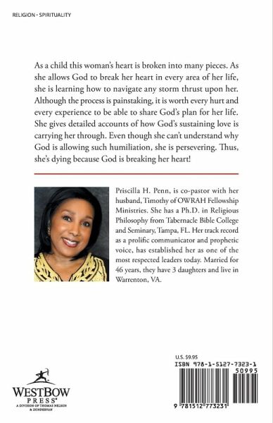 As a child this woman’s heart is broken into many pieces. As she allows God to break her heart in every area of her life, she is learning how to navigate any storm thrust upon her. Although the process is painstaking, it is worth every hurt and every experience to be able to share God’s plan for her life. She gives detailed accounts of how God’s sustaining love is carrying her through. Even though she can’t understand why God is allowing such humiliation, she is persevering. Thus, she’s dying because God is breaking her heart!