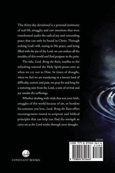 This thirty-day devotional is a personal testimony of real-life struggles and raw emotions that were transformed under the radical joy and resounding peace that can only be found in Christ. Through seeking God's will, resting in His peace, and being filled with the joy of the Lord, we can endure all the troubles of this world and find purpose in the pain. The title, Lord, Bring the Rain, testifies to the refreshing renewal the Holy Spirit pours over us when we cry out to Him. In times of drought, when we feel we are wandering in a barren land of difficulty, sorrow, and pain, we pray for and long for a restoring rain from the Lord, a rain of revival and joy amidst the sufferings. Whether dealing with trials that test your faith, struggles of this world because of sin, or burdens for someone you love, Lord, Bring the Rain offers encouragement rooted in scripture and biblical principles that can help you find the strength to carry on as the Lord works through your drought.