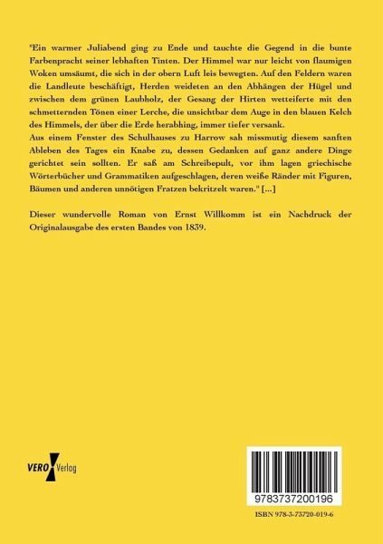 Aus einem Fenster des Schulhauses zu Harrow sah missmutig diesem sanften Ableben des Tages ein Knabe zu, dessen Gedanken auf ganz andere Dinge gerichtet sein sollten. Er saß am Schreibepult, vor ihm lagen griechische Wörterbücher und Grammatiken aufgeschlagen, deren weiße Ränder mit Figuren, Bäumen und anderen unnötigen Fratzen bekritzelt waren." [...]