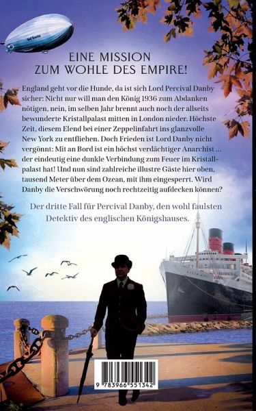 Eine Mission zum Wohle des Empire!England geht vor die Hunde, da ist sich Lord Percival Danby sicher: Nicht nur will man den König 1936 zum Abdanken nötigen, nein, im selben Jahr brennt auch noch der allseits bewunderte Kristallpalast mitten in London nieder. Höchste Zeit, diesem Elend bei einer Zeppelinfahrt ins glanzvolle New York zu entfliehen. Doch Frieden ist Lord Danby nicht vergönnt: Mit an Bord ist ein höchst verdächtiger Anarchist ... der eindeutig eine dunkle Verbindung zum Feuer im Kristallpalast hat! Und nun sind zahlreiche illustre Gäste hier oben, tausend Meter über dem Ozean, mit ihm eingesperrt. Wird Danby die Verschwörung noch rechtzeitig aufdecken können?Der dritte Fall für Percival Danby, den wohl faulsten Detektiv des englischen Königshauses.