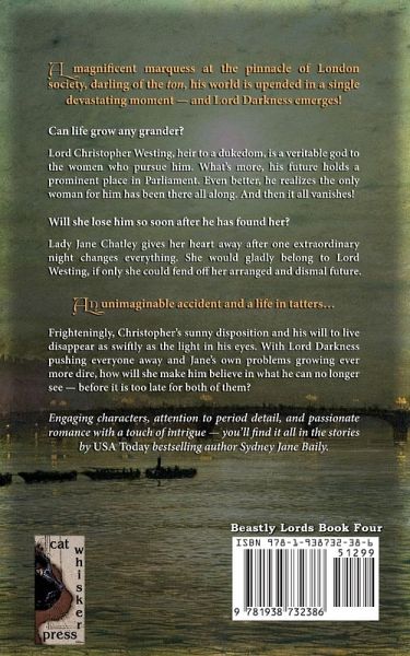 A magnificent marquess at the pinnacle of London society, darling of the ton, his world is upended in a single devastating moment - and Lord Darkness emerges! Can life grow any grander? Lord Christopher Westing, heir to a dukedom, is a veritable god to the women who pursue him. What's more, his future holds a prominent place in Parliament. Even better, he realizes the only woman for him has been there all along. And then it all vanishes! Will she lose him so soon after he has found her? Lady Jane Chatley gives her heart away after one extraordinary night changes everything. She would gladly belong to Lord Westing, if only she could fend off her arranged and dismal future. An unimaginable accident and a life in tatters . . . Frighteningly, Christopher's sunny disposition and his will to live disappear as swiftly as the light in his eyes. With Lord Darkness pushing everyone away and Jane's own problems growing ever more dire, how will she make him believe in what he can no longer see - before it is too late for both of them? Engaging characters, attention to period detail, and passionate romance with a touch of intrigue - you'll find it all in the stories by USA Today bestselling author Sydney Jane Baily.