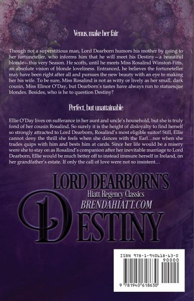 Venus, make her fair Though not a superstitious man, Lord Dearborn humors his mother by going to her fortuneteller, who informs him that he will meet his Destiny-a beautiful blonde-this very Season. He scoffs, until he meets Miss Rosalind Winston-Fitts, an absolute vision of blonde loveliness. Entranced, he believes the fortuneteller may have been right after all and pursues the new beauty with an eye to making her his wife. To be sure, Miss Rosalind is not as witty or lively as her small, dark cousin, Miss Elinor O'Day, but Dearborn's tastes have always run to statuesque blondes. Besides, who is he to question Destiny? Perfect, but unattainable Ellie O'Day lives on sufferance in her aunt and uncle's household, but she is truly fond of her cousin Rosalind. So surely it is the height of disloyalty to find herself so strongly attracted to Lord Dearborn, Rosalind's most eligible suitor! Still, Ellie cannot deny the thrill she feels when she dances with the Earl...nor when she trades quips with him and bests him at cards. Since her life would be a misery were she to stay on as Rosalind's companion after her inevitable marriage to Lord Dearborn, Ellie would be much better off to instead immure herself in Ireland, on her grandfather's estate. If only the call of love were not so insistent... Book 3 of Brenda Hiatt's bestselling Hiatt Regency Classics collection.