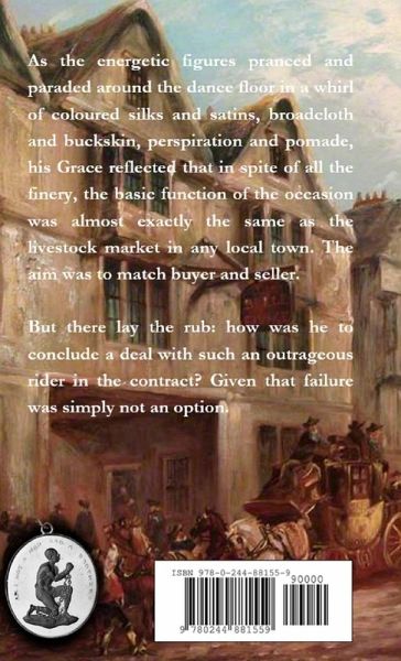 As the energetic figures pranced and paraded around the dance floor in a whirl of coloured silks and satins, broadcloth and buckskin, perspiration and pomade, his Grace reflected that in spite of all the finery, the basic function of the occasion was almost exactly the same as the livestock market in any local town. The aim was to match buyer and seller. But there lay the rub: how was he to conclude a deal with such an outrageous rider in the contract? And failure was simply not an option.