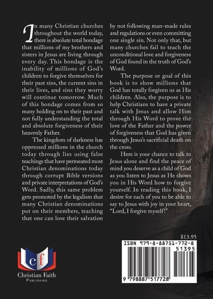 In many Christian churches throughout the world today, there is absolute total bondage that millions of my brothers and sisters in Jesus are living through every day. This bondage is the inability of millions of God's children to forgive themselves for their past sins, the current sins in their lives, and sins they worry will continue tomorrow. Much of this bondage comes from so many holding on to their past and not fully understanding the total and absolute forgiveness of their heavenly Father. The kingdom of darkness has oppressed millions in the church today through lies using false teachings that have permeated most Christian denominations today through corrupt Bible versions and private interpretations of God's Word. Sadly, this same problem gets promoted by the legalism that many Christian denominations put on their members, teaching that one can lose their salvation by not following man-made rules and regulations or even committing one single sin. Not only that, but many churches fail to teach the unconditional love and forgiveness of God found in the truth of God's Word. The purpose or goal of this book is to show millions that God has totally forgiven us as His children. Also, the purpose is to help Christians to have a private talk with Jesus and allow Him through His Word to prove the love of the Father and the power of forgiveness that God has given through Jesus's sacrificial death on the cross. Here is your chance to talk to Jesus alone and find the peace of mind you deserve as a child of God as you listen to Jesus as He shows you in His Word how to forgive yourself. In reading this book, I desire for each of you to be able to say to Jesus with joy in your heart, "Lord, I forgive myself!"