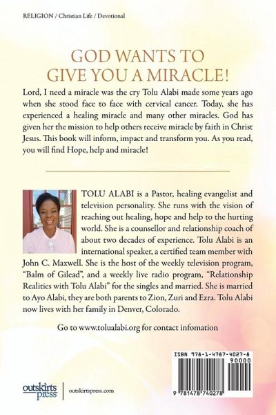 GOD WANTS TO GIVE YOU A MIRACLE! Lord, I need a miracle was the cry Tolu Alabi made some years ago when she stood face to face with cervical cancer. Today, she has experienced a healing miracle and many other miracles. God has given her the mission to help others receive miracle by faith in Christ Jesus. This book will inform, impact and transform you. As you read, you will find Hope, help and miracle!