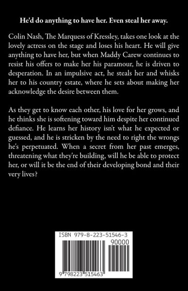 He'd do anything to have her. Even steal her away. Colin Nash, The Marquess of Kressley, takes one look at the lovely actress on the stage and loses his heart. He will give anything to have her, but when Maddy Carew continues to resist his offers to make her his paramour, he is driven to desperation. In an impulsive act, he steals her and whisks her to his country estate, where he sets about making her acknowledge the desire between them. As they get to know each other, his love for her grows, and he thinks she is softening toward him despite her continued defiance. He learns her history isn't what he expected or guessed, and he is stricken by the need to right the wrongs he's perpetuated. When a secret from her past emerges, threatening what they're building, will he be able to protect her, or will it be the end of their developing bond and their very lives? This contains some darker elements that could be triggering for some readers.