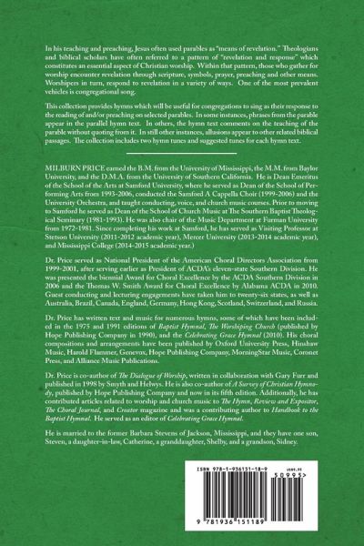 In his teaching and preaching, Jesus often used parables as "means of revelation." Theologians and biblical scholars have often referred to a pattern of "revelation and response" which constitutes an essential aspect of Christian worship. Within that pattern, those who gather for worship encounter revelation through scripture, symbols, prayer, preaching and other means. Worshipers in turn, respond to revelation in a variety of ways. One of the most prevalent vehicles is congregational song. This collection provides hymns which will be useful for congregations to sing as their response to the reading of and/or preaching on selected parables. In some instances, phrases from the parable appear in the parallel hymn text. In others, the hymn text comments on the teaching of the parable without quoting from it. In still other instances, allusions appear to other related biblical passages. The collection includes two hymn tunes and suggested tunes for each hymn text.
