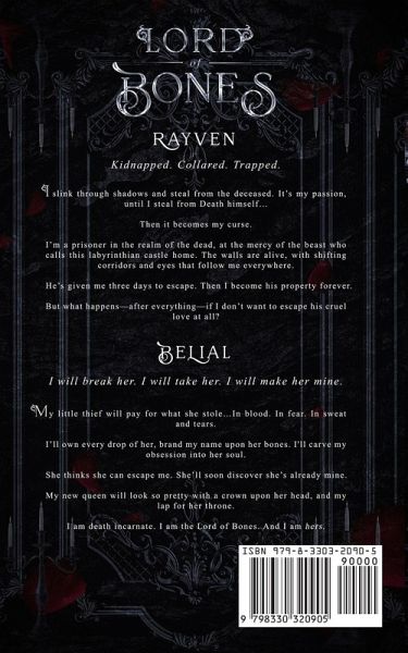 Rayven Kidnapped. Collared. Trapped. I slink through shadows and steal from the deceased. It's my passion, until I steal from Death himself... Then it becomes my curse. I'm a prisoner in the realm of the dead, at the mercy of the beast who calls this labyrinthian castle home. The walls are alive, with shifting corridors and eyes that follow me everywhere. He's given me three days to escape. Then I become his property forever. But what happens-after everything-if I don't want to escape his cruel love at all? Belial I will break her. I will take her. I will make her mine. My little thief will pay for what she stole...In blood. In fear. In sweat and tears. I'll own every drop of her, brand my name upon her bones. I'll carve my obsession into her soul. She thinks she can escape me. She'll soon discover she's already mine. My new queen will look so pretty with a crown upon her head, and my lap for her throne. I am death incarnate. I am the Lord of Bones. And I am hers.