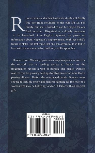 Rowan believes that her husband's death will finally free her from servitude to the evil Du La Fey family, but she is forced to use her magic for one final mission. Disguised as a dowdy governess in the household of an English diplomat, she passes on information about Napoleon's imprisonment. With her child's future at stake, the last thing that she can afford to do is fall in love with the one man who could very well expose her. Damien, Lord Wodesby, poses as a stage magician to uncover the network that is sending secrets to France. As the investigation reveals a web of intrigue and magic, Damien realizes that his growing feelings for Rowan are far more than a passing illusion. Before the masquerade ends, Damien must choose to risk his honor and magical heritage for the love of a woman who may be both a spy and an Outsider without magical gifts.
